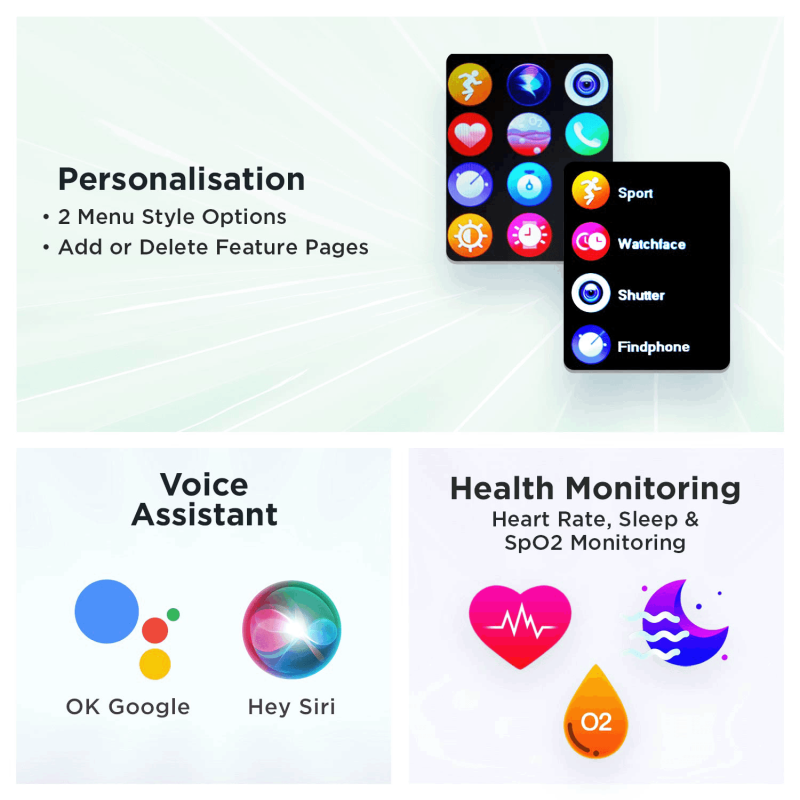 Personalization- Add a touch of personalization to your watch with 2 menu style options to choose from. Easily navigate through the watch and keep all your go-to features just a swipe away by adding or deleting feature pages on the home screen.