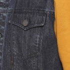 Charcoal washed colourblocked windcheater denim jacket, has a hooded, 4 pockets ,has a button closure, long sleeves, straight hemline, cotton lining
