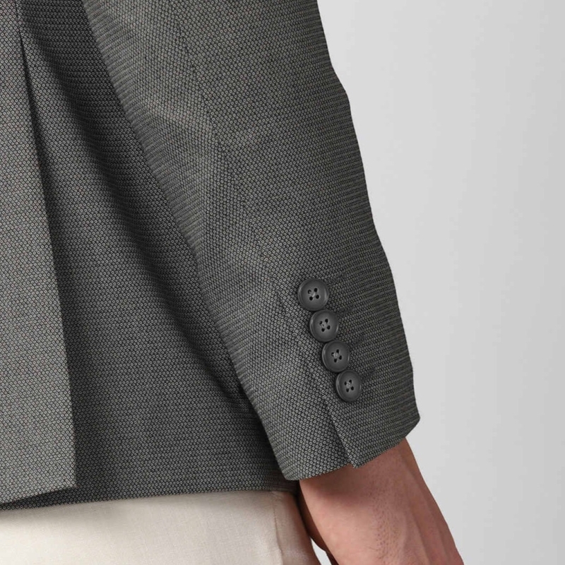 • Grey self design slim fit formal blazer, has a notched lapel collar, long sleeves with buttons, single breasted with button closures,2 mock pockets with flaps ,1 pocket on chest and 2 internal pockets, attached lining, double vented back hem.