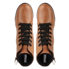 • A pair of black/Brown/tan/Grey round toe heeled boots, has high-top styling, lace-ups detail