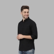 Black solid casual shirt, has a spread collar, button placket, and curved hem